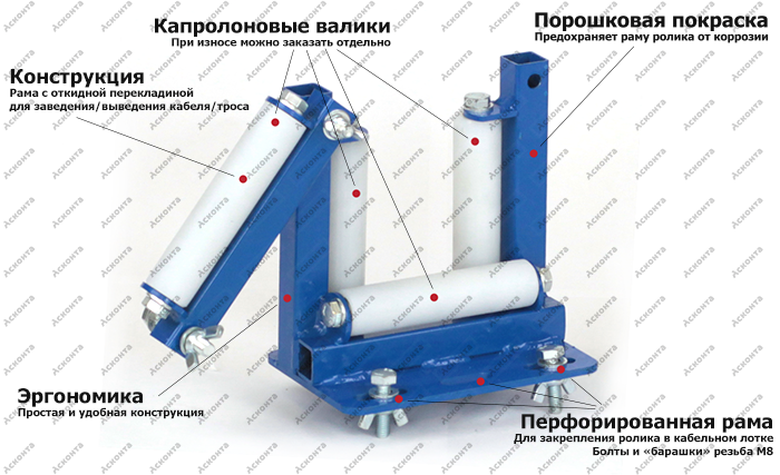 Данный ролик может устанавливаться как на прямых участках, так и на углах поворота или с перепадом высот. Благодаря особой конструкции типа «квадрат» или «окно» ролик задает точное направление кабелю и защищает его от повреждения.